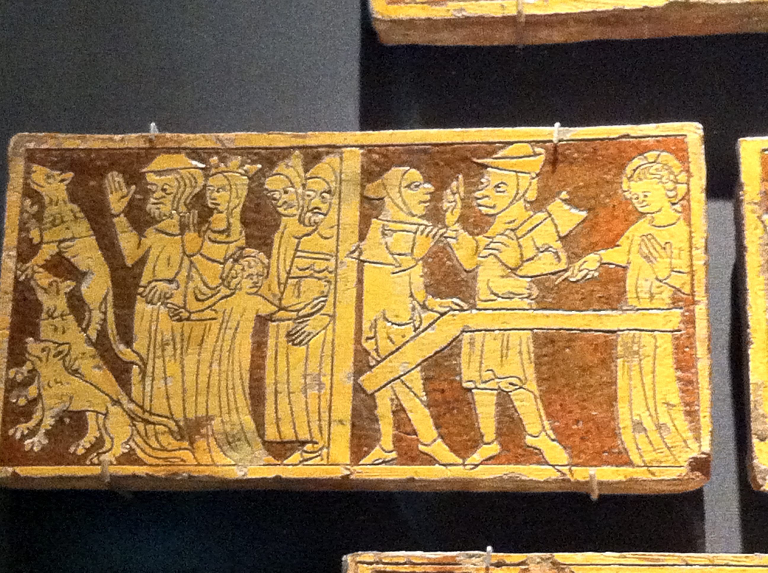 IMG_3738 Published 10 februarja 13 at 2592 × 1936 in VEČER V MUZEJU ← Previous Naprej → Jezuščkove dogodivščine Levo: Jezus kaže na levje mladičke v igri in se posmehuje dvema moškima za hrbtom svojih staršev. Desno: Mojster s sekiro krega delavca, ker je prekratko odrezal kol, medtem ko Jezus opazuje.